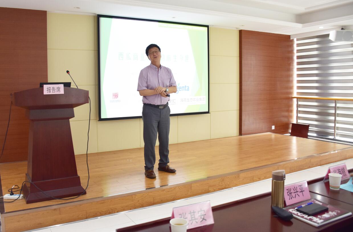 ??? 張興平博士在會上作《國際西甜瓜研究現狀與未來發展方向的報告》,對西瓜育種前生今世進行介紹,就西甜瓜新品種的選育理念、方法、路徑做了生動的講解。