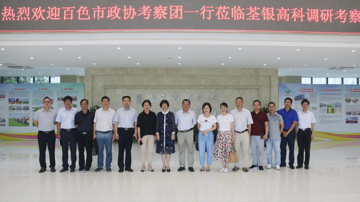 ??? 2019年7月8日下午,廣西壯族自治區百色市政協副主席蔡文姬率考察團一行蒞臨荃銀高科調研考察。合肥市政協人資環委主任張立、市農業農村局副局長李軍、高新區農村工作局副局長江水等領導陪同調研。荃銀高科副董事長兼總經理張琴、副總經理兼首席技術官張從合、財務總監張慶一等領導熱情接待了考察團一行。